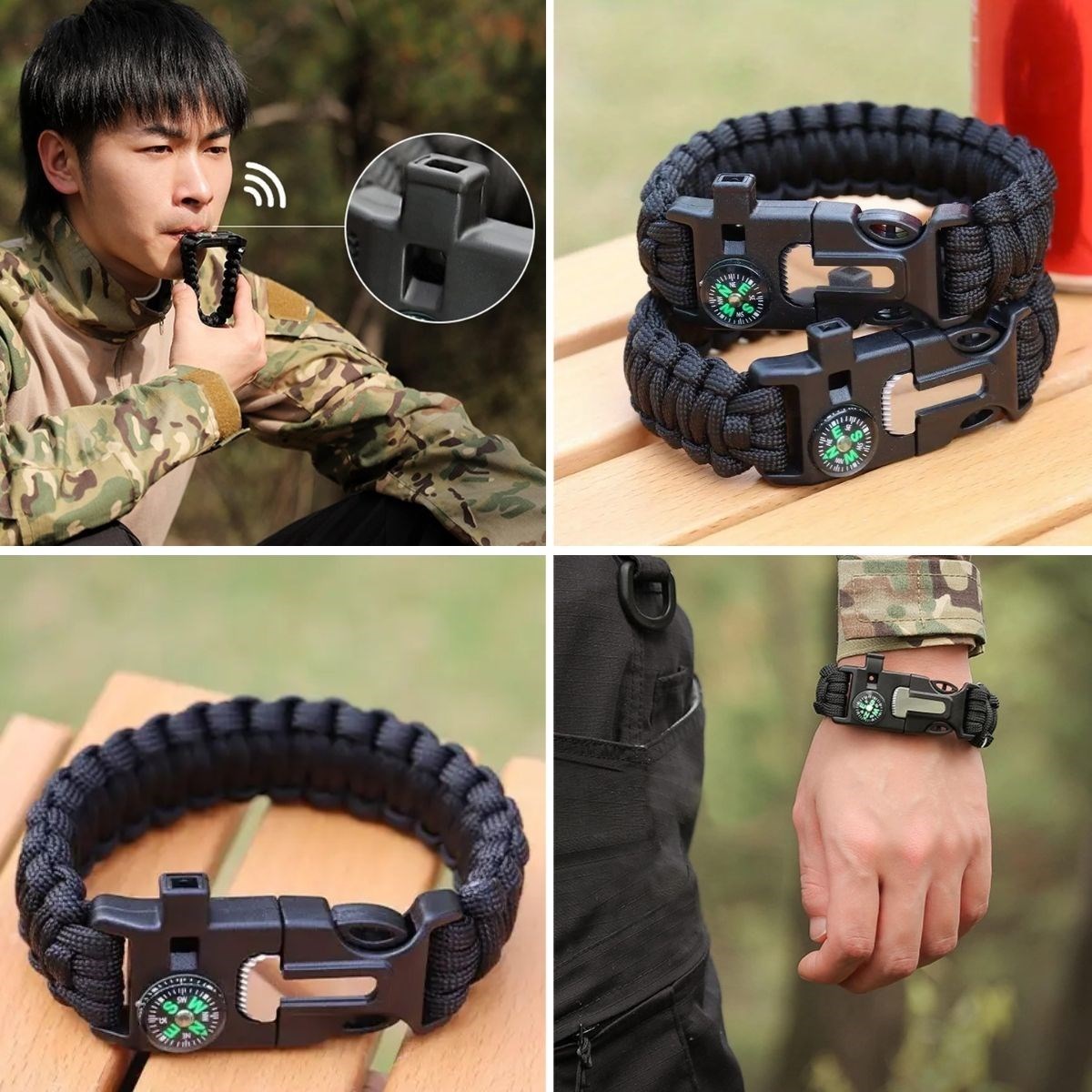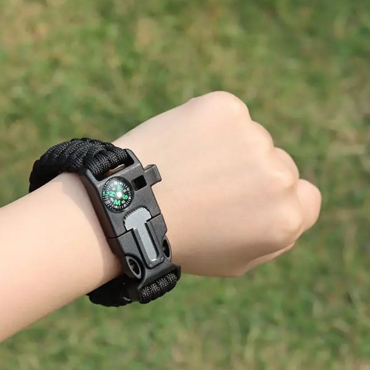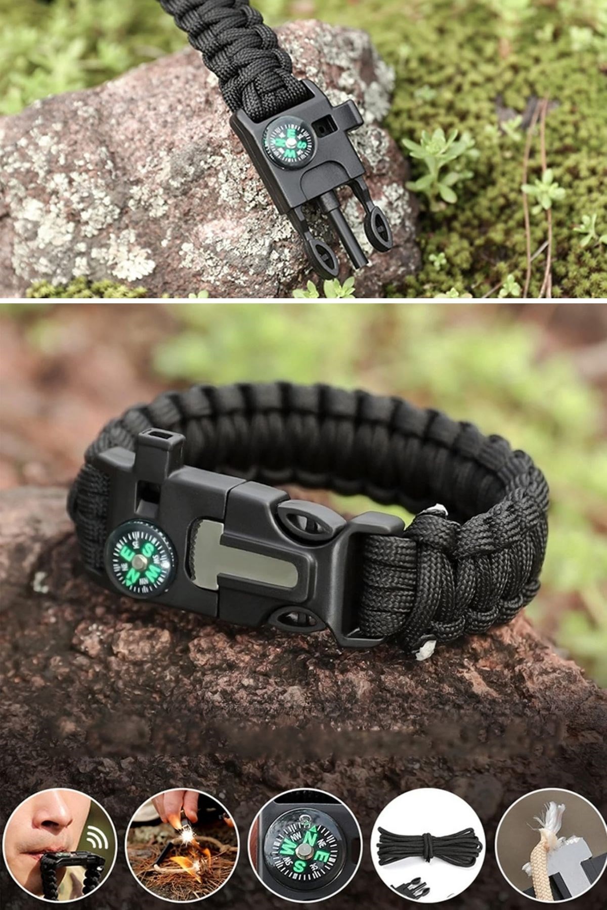 • 5 fonksiyon bir arada: pusula, düdük, çakmak taşı, ip ve bileklik
